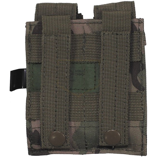 Keep your small ammunition organized with the MFH Ammo Pouch Double Small MOLLE in Operation Camo. Features velcro lid flaps, 2 Molle fastening loops, and press buttons for secure closure. Made of 100% Polyester. Compact and durable design.