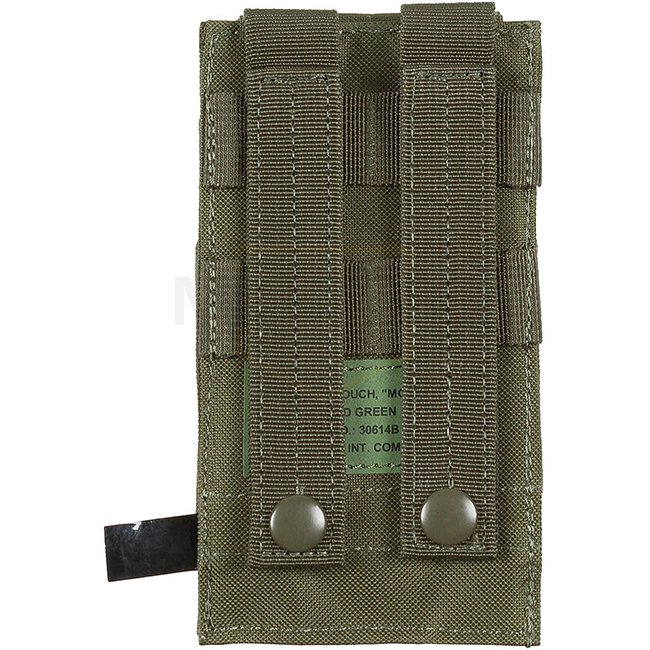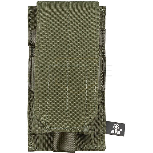 MFH Ammo Pouch MOLLE - Olive: Versatile ammo pouch with adjustable lid flap, elastic loop, and Molle fastening loops for secure storage. Crafted from 100% Polyester. Dimensions: 8.5 x 16 x 5 cm.
