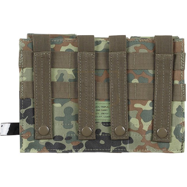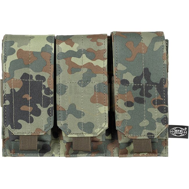 MFH Ammo Pouch Triple MOLLE - Flecktarn. Durable ammo pouch with adjustable lid flaps, elastic loops, Molle fastening loops, and press button closure. Perfect for storing magazines. Made of 100% Polyester.