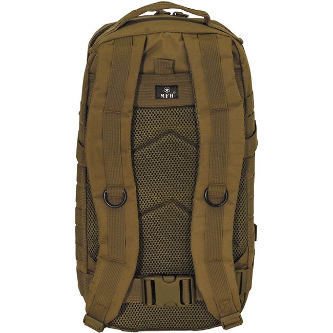 MFH Backpack Assault 1 Basic - Coyote: Adjustable, padded shoulder straps, detachable waist strap, hydration pack compartment, breathable mesh paddings, multiple compartments and pockets, Molle attachment loops, 30 l capacity. Polyester material.