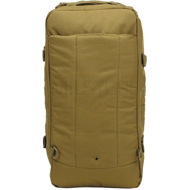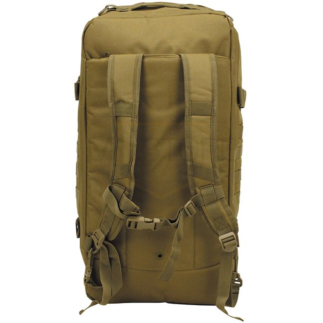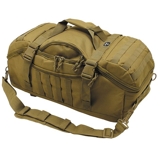 MFH Backpack Bag Travel - Coyote. Detachable, adjustable shoulder strap with detachable and adjustable padding. Padded back part with adjustable straps and chest strap. Carrying system stowable in bag. Top carrying handle. Lateral handles with D-rings. Mo