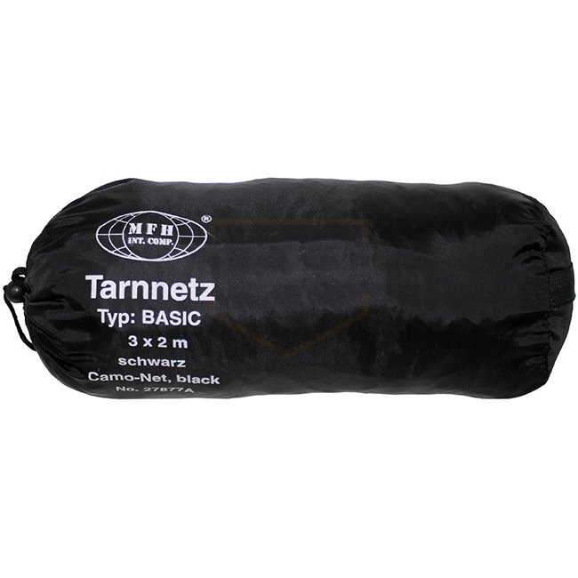 MFH Basic Camo Net 2 x 3 m - Black: Durable camo net with carrier net and fixation loops. Made of 100% Polyester with Polyacrylate coating. Includes transport bag for convenience.