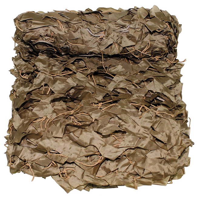 Camouflage net in coyote color, 2 x 3 m size. With carrier net and multiple fixation loops. Made from 100% Polyester with Polyacrylate coating. Includes transport bag. Ideal for outdoor activities.