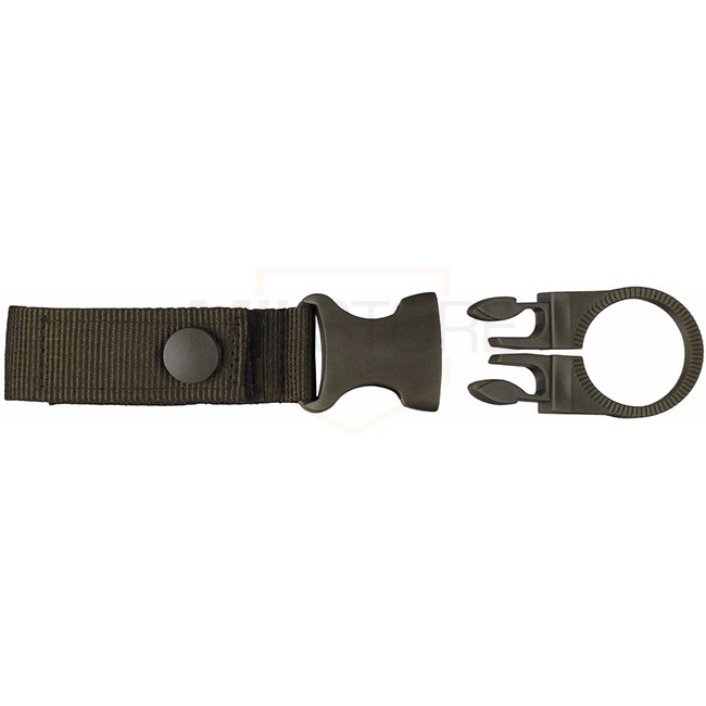 MFH Belt & MOLLE Bottle Holder - Olive: Securely fasten your drink bottle with this convenient holder. Easy removal and secure fastening for plastic bottles. Loop size 2.5x7cm, total length 16cm, holder width 3.5cm. Made of 100% polyester and polypropylen