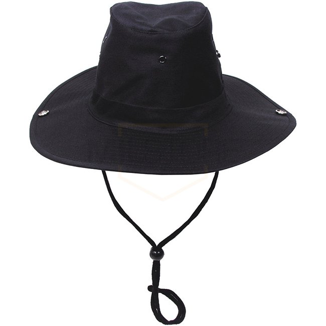 MFH Bush Hat in Black, size 57. Multi-quilted brim with press buttons for folding, 4 ventilation eyelets, chin guard with cord stopper, reinforced material. Material: 65% Polyester, 35% Cotton.