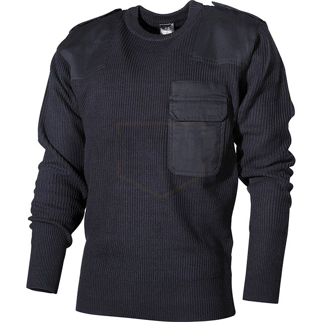 Stay warm and stylish with MFH BW Pullover Chest Pocket made of Polyacryl in Blue color. Features include a patch pocket on the left chest with flap and velcro, additional pen pockets, 2 epaulettes with velcro, facing on elbows, knitted collar, and 2 smal