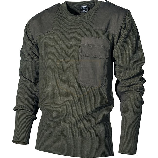MFH BW Pullover with Chest Pocket - Olive - Size 60. Made of durable polyacryl material with useful features like a patch pocket on the chest, pen pockets, epaulettes, elbow facing, knitted collar, and German flags included. Material: 100% Acrylic, Trimmi
