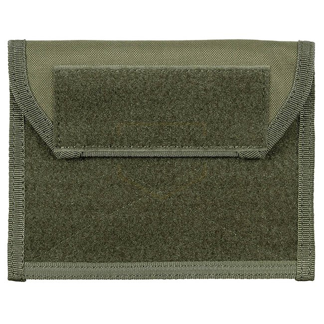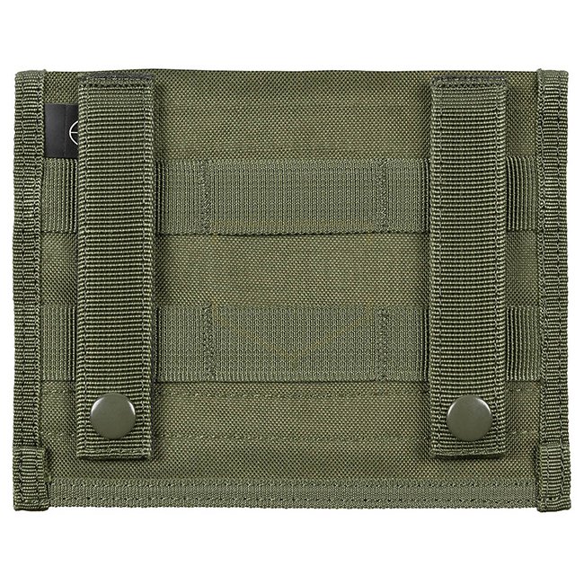 MFH Chest Pouch MOLLE in Olive with 2 compartments, elastic loops, velcro closure, and Molle fastening loops. Made of 100% Polyester. Dimensions: 18 x 14 cm.