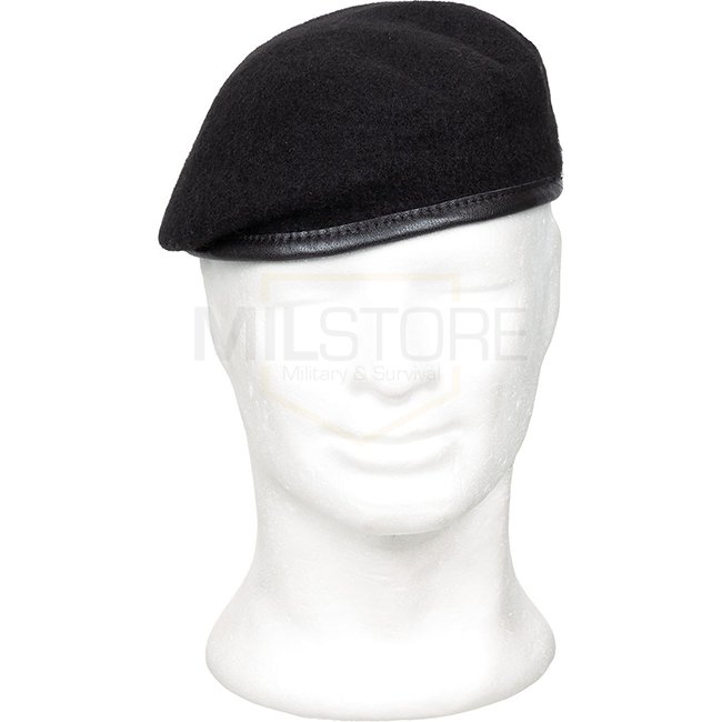 MFH Commando Beret in Black with a size of 59. French commando beret style with a German touch. Made of 100% wool and lined with 100% polyester. Features a leather hem edge with drawstring and 2 ventilation eyelets on the right side for comfort.