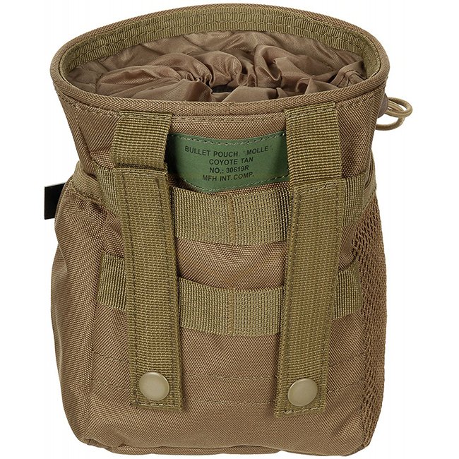 MFH Dump Pouch MOLLE in Coyote color features a large opening with drawstring closure, multiple spacious pockets, and Molle fastening loops. Made of 100% Polyester.