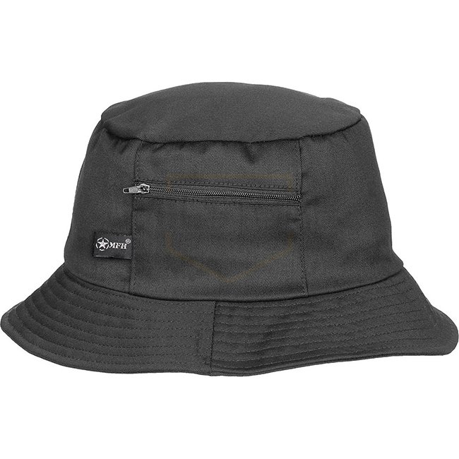 MFH Fisher Hat Small Side Pocket in Black - Size 55. Classic fisher hat with pockets, zip, ventilation eyelets and Polyester/Cotton material blend.