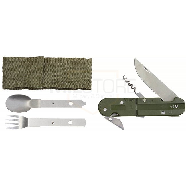 MFH Foldable Cutlery Set - Olive: Knife, fork, spoon, can-/ bottle opener, corkscrew, nylon etui with belt loop and belt clip. Pack size: ca. 15 x 5 x 3 cm. No export to France!