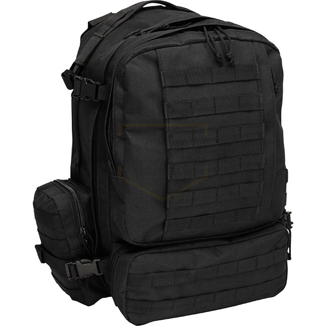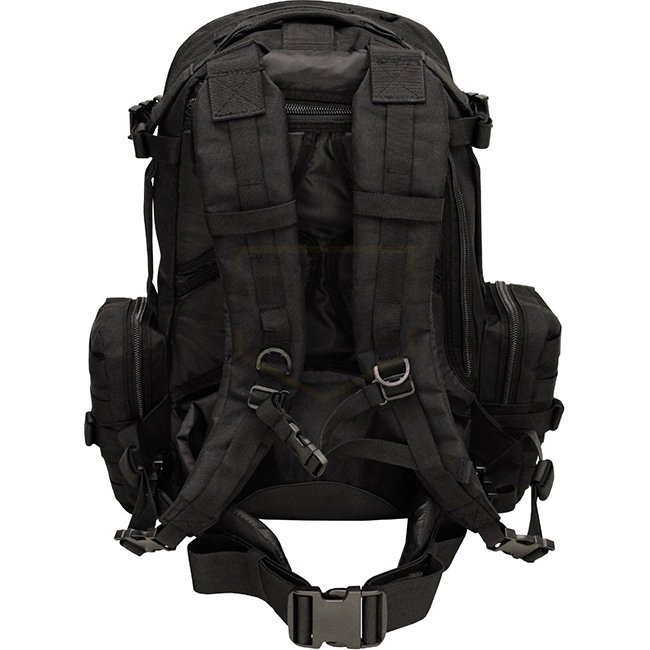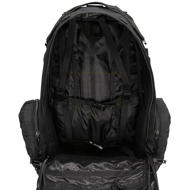 Padded and adjustable shoulder- and waist straps, adjustable chest strap padded back part with removable frame plate and 1 slide-in pocket with zip 1 carrying handle on top and both sides main compartment completely unfoldable with 2-way zip, 3 openings to the main compartment for drinking tube or cable as well as 4 pack straps and 2 mesh pockets with zip 1 front pocket with 2-way zip and inside carabiner various slide-in pockets and pen holders 1 attached slide-in pocket with lateral zip and Molle attachment loops 1 bottom front pocket with 2-way zip with mesh inserts and Molle attachment loops 2 side pockets with 2-way zip and Molle attachment loops, click closures 2 compression straps on each side Capacity: ca. 45 l Dimensions: ca. 42 x 53 x 30 cm (W x H x D) Weight: ca. 2,3 kg