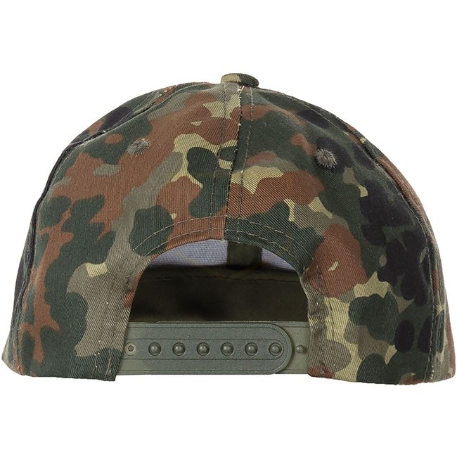 MFH Kids BB Cap - Flecktarn adjustable snapback cap with reinforced seams, quilted visor, 6 ventilation eyelets. Made of 65% polyester and 35% cotton, one-size-fits-all.