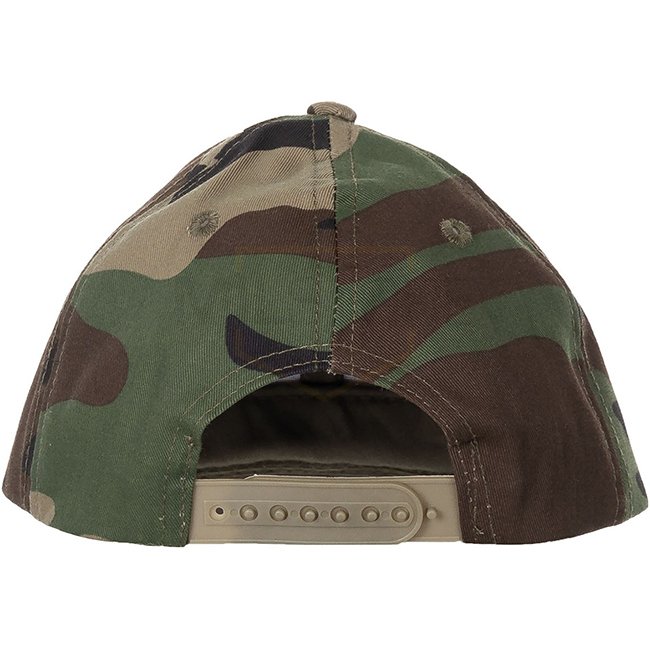 MFH Kids BB Cap - Woodland: Adjustable snapback closure, reinforced seams, bent 4 times quilted visor, 6 ventilation eyelets. Material: 65% Polyester, 35% Cotton. One-size-fits-all.