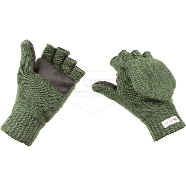 Foldable finger cap with velcro, reinforced palms and thumbs, extra warm lining. Olive XL knitted glove-mittens made with 100% Acrylic outer material and 100% Polyester lining (3M Thinsulate Insulation).