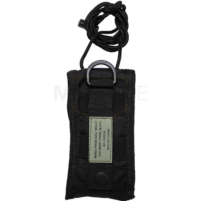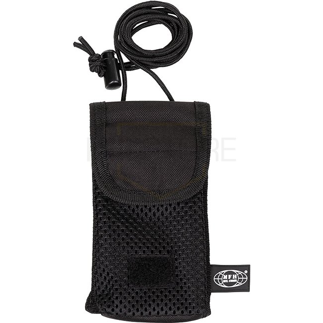 Keep your mobile phone secure and easily accessible with the MFH Mobile Phone Pouch in Black. Featuring a velcro closure lid, front mesh compartment, Molle fastening loop, press button, and adjustable neck strap. Dimensions: 5 x 13 x 3 cm. Made of 100% Po