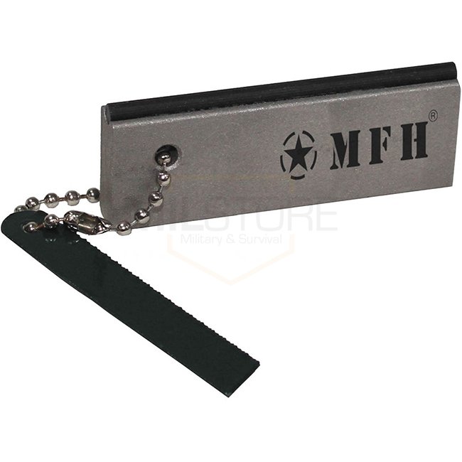 MFH Professional Fire Starter: 2-part fire starter with integrated fire steel, chain, and scraper for easy fire starting. Dimensions: ca. 7,5 x 3 x 1 cm. Made with lanthanum, cerium, copper, iron, zinc, and magnesium.