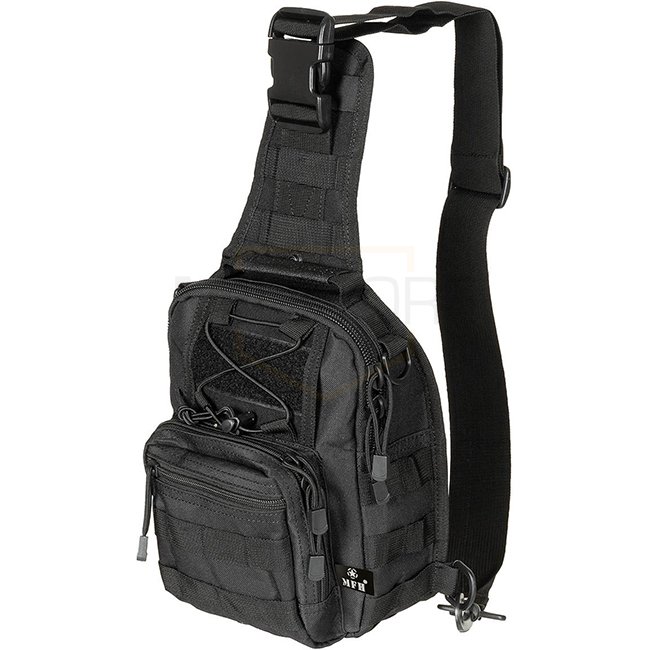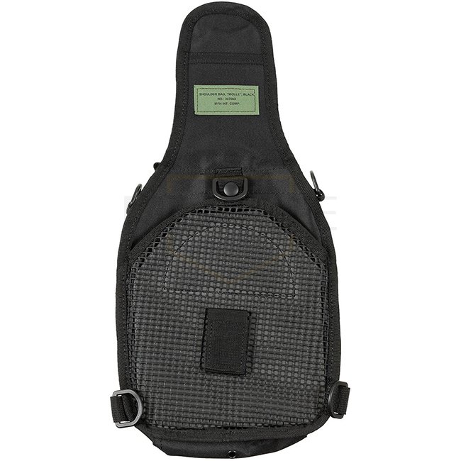 MFH Shoulder Bag MOLLE - Black: Adjustable, detachable shoulder strap with click closure, padded back part, 1 large slide-in compartment, 1 small slide-in compartment, velcro loop, D-ring on each corner, top carrying handle, 1 main compartment with 2-way