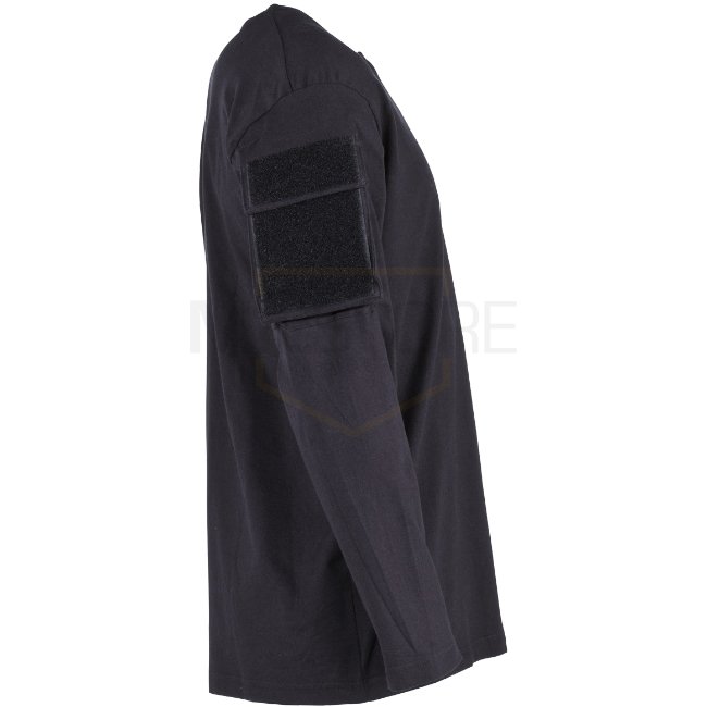MFH Tactical Long Sleeve Shirt Sleeve Pockets in Black - XL. Two velcro sleeve pockets, reinforced crew neck, single jersey. Material: 100% Cotton.