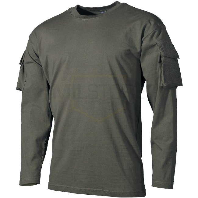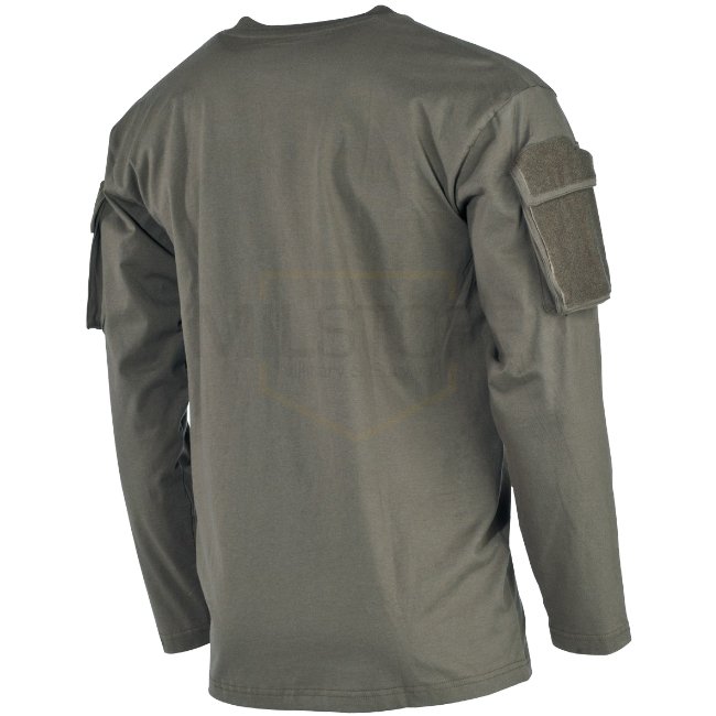 MFH Tactical Long Sleeve Shirt Sleeve Pockets - Olive - L: Durable cotton shirt with two velcro sleeve pockets, reinforced crew neck, and classic single jersey design. 100% Cotton material for comfort and style.