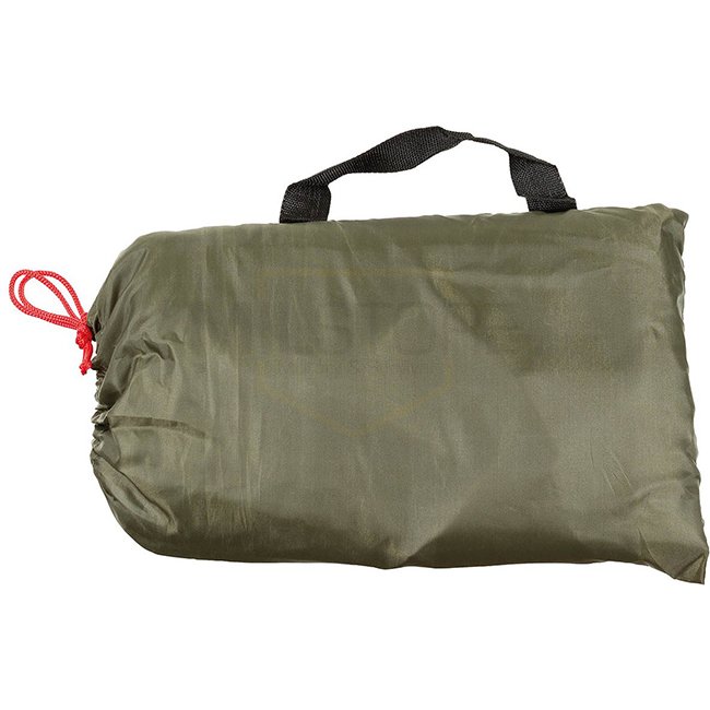 MFH Tarpaulin 300 x 300 cm - Olive. Waterproof, versatile tarpaulin for tent, raincover, sun shelter, or ground sheet. 8 reinforced metal eyelets. Water column: 1500 mm. Material: 100% Polyester (190T PU-coated).