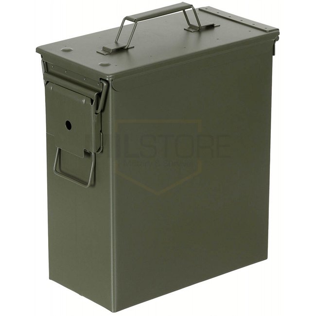 MFH US Ammo Box cal. 50 PA 60 Metal - Olive is a rugged and versatile ammo box that offers ample storage space. It features a splash-proof design with a removable lid, rubber seal, and a catch fastener. The foldable carrying handle makes it easy to transp
