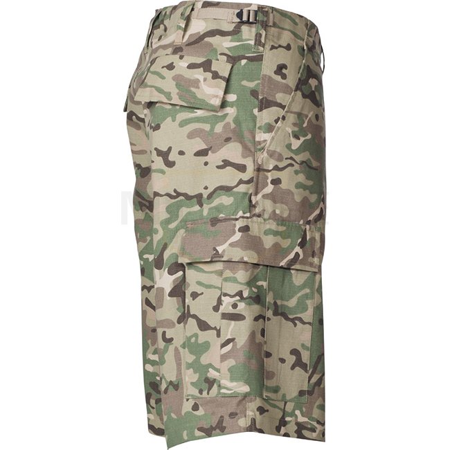 MFH US Bermuda Shorts in ripstop material with Operation Camo design. Features button fly, 6 pockets with flap and buttons, adjustable waistband, and extra wide belt loops. Made of 100% Cotton.