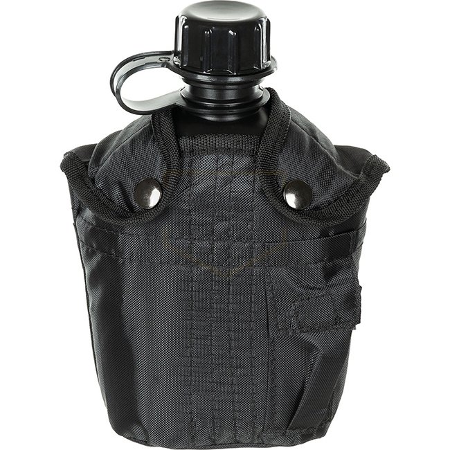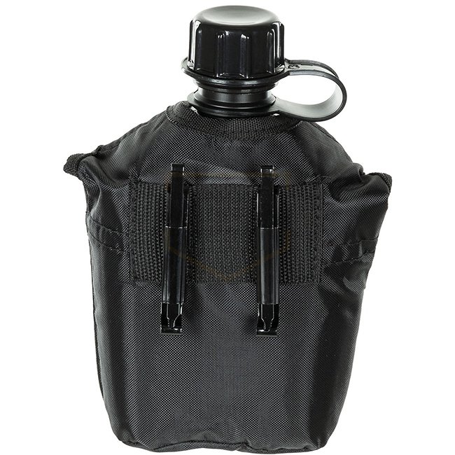 MFH US Canteen & Cover 1 l - Black. Screw cap, padded cover, outside pocket with velcro, retaining clips for fixation. Dimensions: 13 x 21 x 8 cm. Weight: 200g. Material: Bottle - 100% Polyethylene, Cover - 100% Polyester.