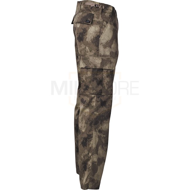 MFH US Combat Pants in HDT Camo - 3XL. Classic US ARMY pants with front zip, 6 pockets, adjustable waistband, and drawstring hem. Made of 65% Polyester, 35% Cotton.