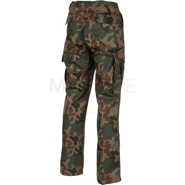 MFH US Combat Pants - PL Woodland - L: Classic US ARMY pants with adjustable waistband, 6 pockets, and durable polyester-cotton blend material. Perfect for outdoor activities.