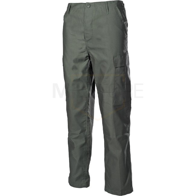 MFH US Combat Pants Reinforced in Olive, classic US ARMY design featuring button fly, multiple pockets, adjustable waistband, reinforced knees and seat. 65% Polyester, 35% Cotton.