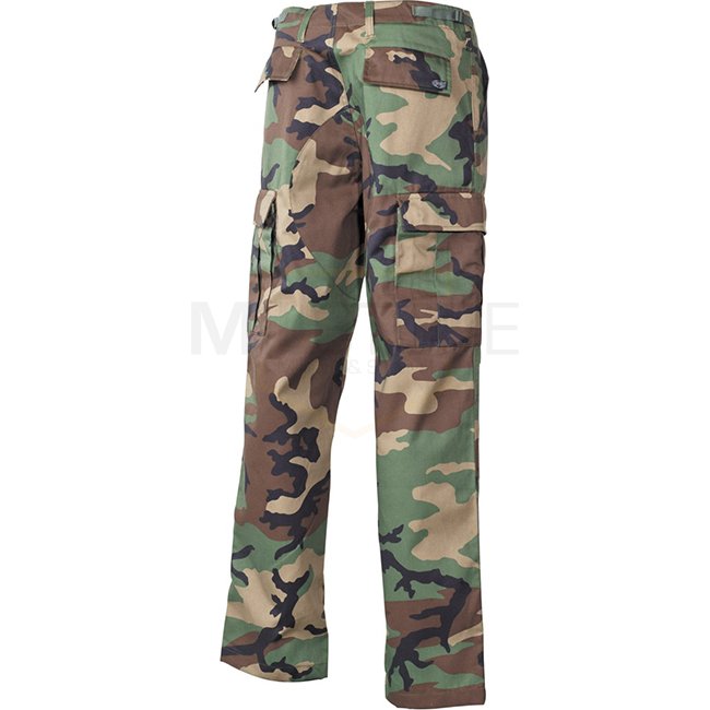 MFH US Combat Pants Reinforced - Woodland - XL are classic US ARMY pants with button fly, adjustable waistband, and reinforced knees and seat. Made of 65% Polyester and 35% Cotton.