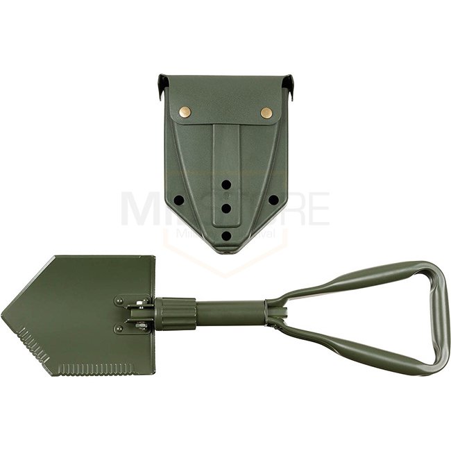 MFH US Folding Spade Extra Solid - Olive. Robust steel handle and blade, doubles as a hoe. Serrated edge on one side, foldable design with screw lock. Includes belt fixation case. Blade size: approx. 21 x 16 cm. Total length: approx. 60 cm. Pack size: app