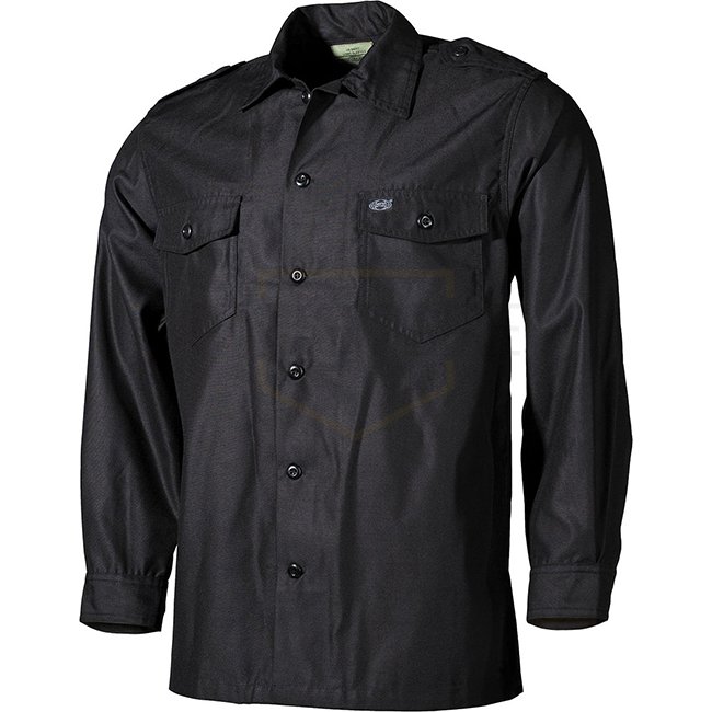MFH US Shirt Long Sleeve - Black - XL has a classic design with buttonhole placket, 2 patch chest pockets, sleeve ends with button cuffs, and epaulettes with buttons. Made of 65% Polyester and 35% Cotton.