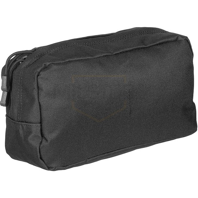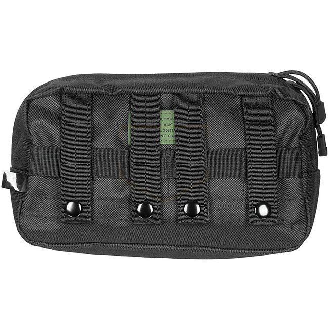 MFH Utility Pouch MOLLE Large in Black, with 2-way zip compartment, elastic loops on sides, Molle attachment loops, 4 fastening loops, and press button. Dimensions: 25 x 13.5 x 9 cm. Weighs around 190 g. Made of 100% Polyester.