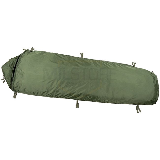 HighDefence GB Sleeping Bag in Olive - light weight, modular design with rollable mosquito net, hood-shaped head part, mesh pockets, adjustable shoulder area, and full-length zip. Versatile product suitable for various outdoor activities. Dimensions: 235