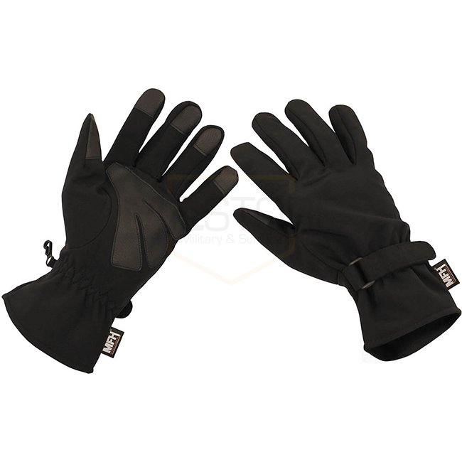 MFHHighDefence Gloves Soft Shell - Black - XL: Lightweight, tactical gloves made of wind- and water-resistant soft shell fabric for high wearing comfort. Breathable, quick-drying, and roughened warm inside. Touchscreen-ready fingertips on index finger, mi