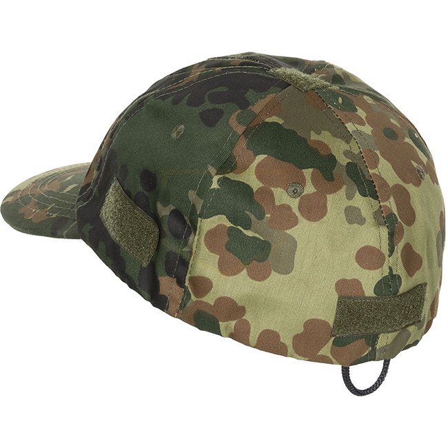 MFH HighDefence Operations Cap Velcro - Flecktarn, one-size-fits-all with 5 velcro panels, elastic sweatband, loop on the back, and 6 ventilation eyelets. Material: 65% Polyester, 35% Cotton.