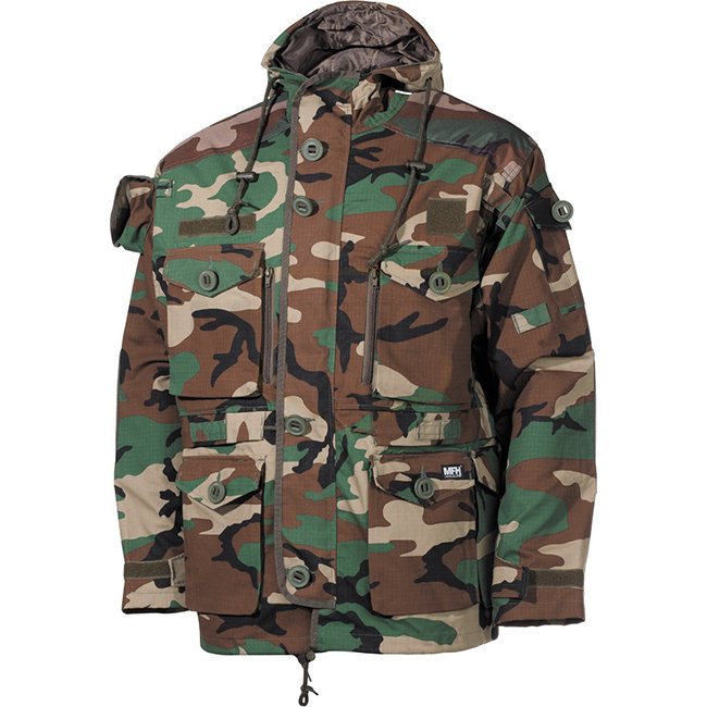 MFHHighDefence SMOCK Commando Jacket Ripstop - Woodland - XL. High-performance military jacket with multiple pockets, adjustable features, reinforced visor, elbow pockets for protectors, and durable materials. Perfect for outdoor activities and rough cond