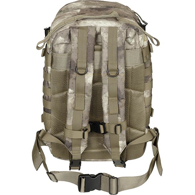 MFHHighDefence US Backpack Assault 2 - HDT Camo - Adjustable, padded shoulder & waist straps, breathable mesh back, hydration pack compartment, multiple zip pockets, Molle attachment loops. Capacity: 40L. Dimensions: 30x48x27cm. 100% Polyester.