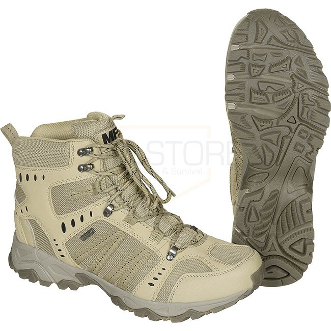 High-quality waterproof and breathable combat boots with excellent running properties and anti-skidding sole. Features lifted toe area, plastic strip for protection, padded bootleg, replacable inner sole, two-zone lacing system, reinforced heel area, and