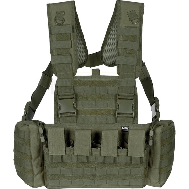 Light, tactical combat vest with modular system also wearable over a ballistic vest shoulder-, abdominal and waist area with breathable mesh padding adjustable, detachable shoulder straps with D rings and various loops as well as an elastic velcro strap at the back 2 lateral utility pouches with 2 way zip as well as Molle attachment loops and 1 D ring inside e.g. suitable for 1 litre US canteen 4 adjustable ammo pouches at the front with velcro, adaptable for all common magazines and usable as double ammo pouches fold-in front panel with map compartment slide-in compartment with velcro at the front inside adjustable waist strap Molle attachment loops and velcro panels all over the outside of the vest for attachment of additional equipment Weight: ca. 1,2 kg