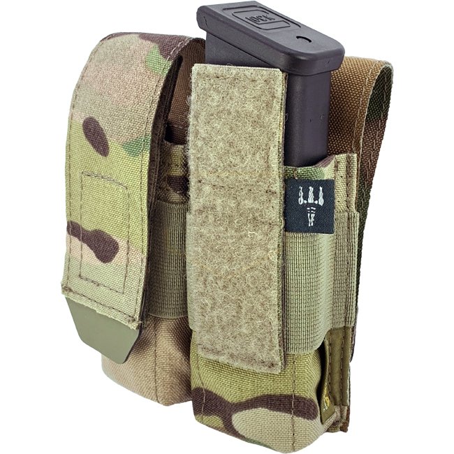 The Pitchfork Closed Double Pistol Magazine Pouch in Multicam is a versatile pouch designed to securely hold most double-stack pistol magazines, including wider .45 cal magazines. Its elastic band ensures a snug fit, while the Hypalon end tab allows for e
