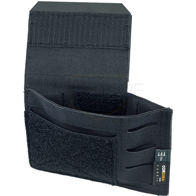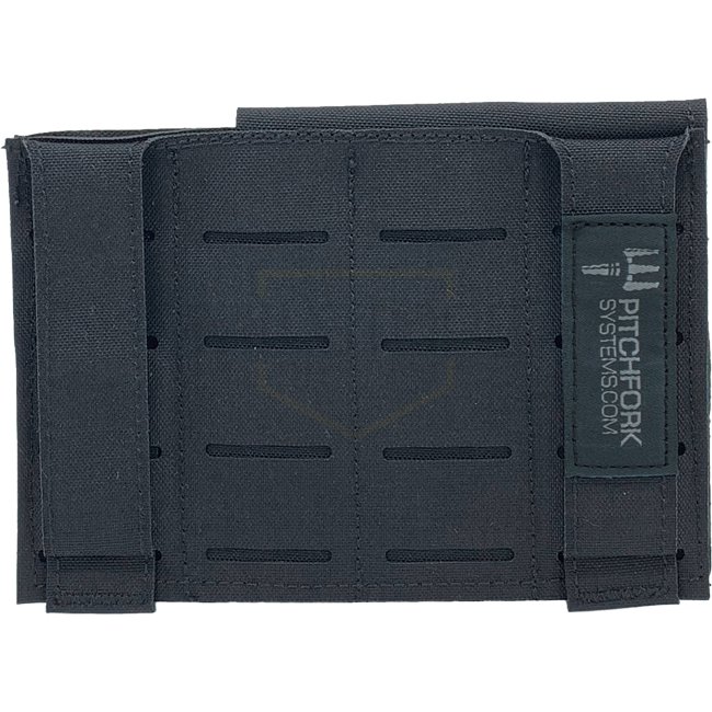 Pitchfork Flat Admin Pouch - Black. Ultra light and flat design fits perfectly between buckles of the MPC Modular Plate Carrier. Velcro front with small pouch compartment. Features wide Hypalon flap for easy access. Low profile design to avoid interferenc