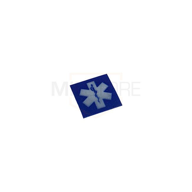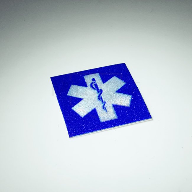 Pitchfork MEDIC Reflective Face Shield Sticker - Blue. Front: reflective, Back: adhesive. Dimensions: 23 x 23 mm.
