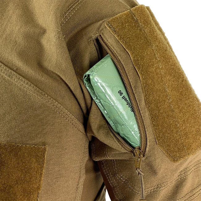 On the sides and under the arms, it has a light, soft and breathable mesh, which provides the necessary cooling in hot situations. Also on the sides pouches can be found for a smartphone or other flat objects. Cable bushings allow concealed routing of headphones or other cables. The integrated pockets on the upper arms with YKK zippers also have cable entries on both sides. Velcro on the arms and on the chest makes it possible to apply name patches, rank insignia and others.