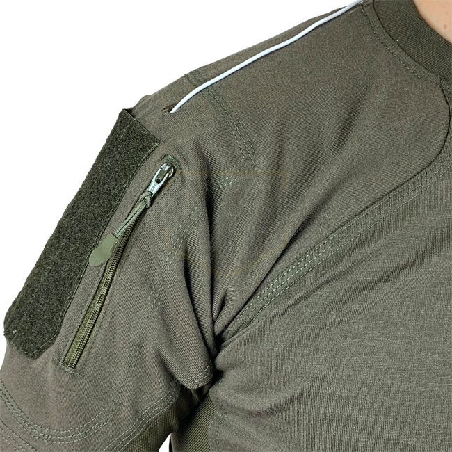 On the sides and under the arms, it has a light, soft and breathable mesh, which provides the necessary cooling in hot situations. Also on the sides pouches can be found for a smartphone or other flat objects. Cable bushings allow concealed routing of headphones or other cables. The integrated pockets on the upper arms with YKK zippers also have cable entries on both sides. Velcro on the arms and on the chest makes it possible to apply name patches, rank insignia and others.