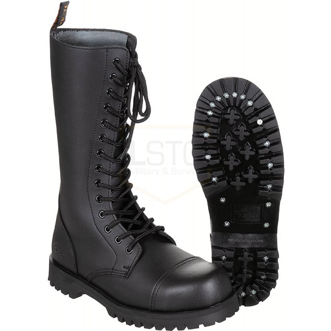 Stylish and durable PureTrash Boots with 14 holes, featuring a steel cap for extra protection. Made of high-quality leather, with metal eyelets and a treaded sole. Perfect for any tough job!