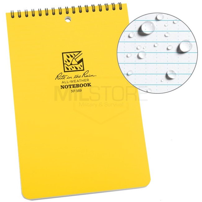 Rugged Rite in the Rain Top Spiral Notebook, 6" x 9.25", with Polydura cover for ultimate durability. Features conversion tools on the cover and 100 waterproof sheets. Made in the USA.
